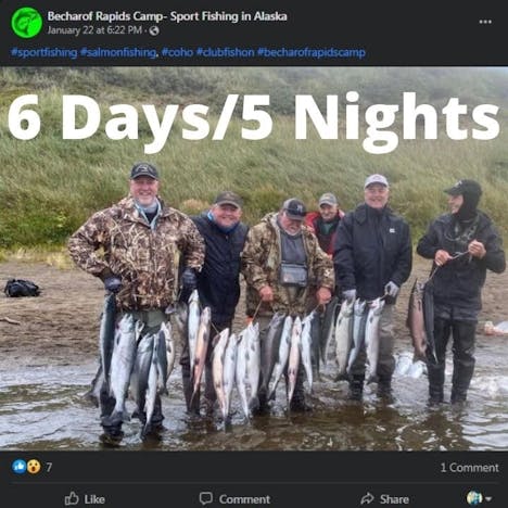"Since you can catch and keep up to 5 Salmon per day, many guests go home with 90-100lbs of fresh wild caught salmon (which has a value of about $1,400 in the grocery store).